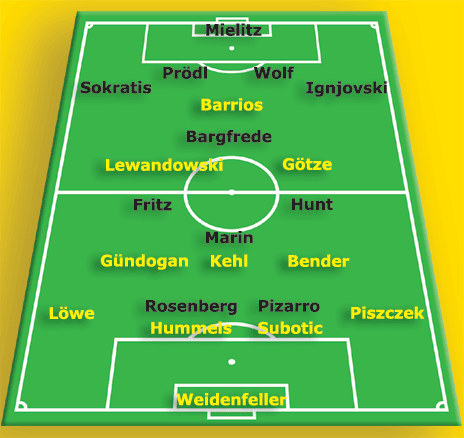 Borussia Dortmund: Weidenfeller – Piszczek, Subotic, Hummels, Löwe – Bender, Kehl, Gündogan – Götze, Lewandowski – Barrios (Kagawa)