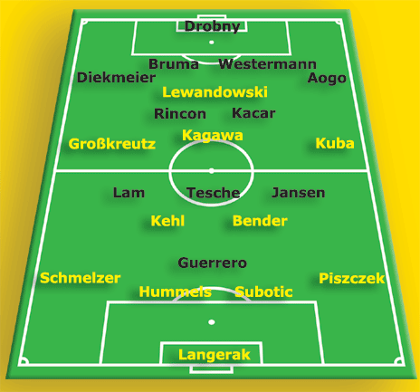 Borussia Dortmund: Langerak – Piszczek, Subotic, Hummels, Schmelzer – Bender, Kehl – Kuba, Kagawa, Großkreutz – Lewandowski